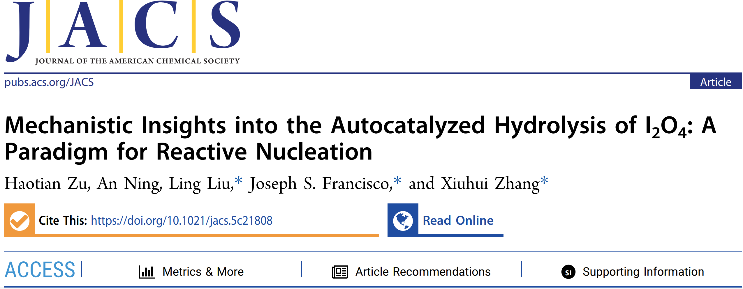 近日,55直播-直播视频 张秀辉教授、刘玲副教授及美国宾夕法尼亚大学 Joseph S. Francisco教授团队合作,在海洋气溶胶成核机制研究方面取得重要进展。相关研究成果以“Mechanistic Insights into the Autocatalysed Hydrolysis of I2O4: A Paradigm for Reactive Nucleation”为题,在国际顶级化学期刊《美国化学会志》(Journal of the American Chemical Society,JACS,DOI: 10.1021/jacs.5c21808)上发表。该工作以55直播-美女直播 为第一通讯单位,张秀辉教授、刘玲副教授和Joseph S. Francisco教授为论文共同通讯作者,55直播 博士研究生祖昊天为第一作者。