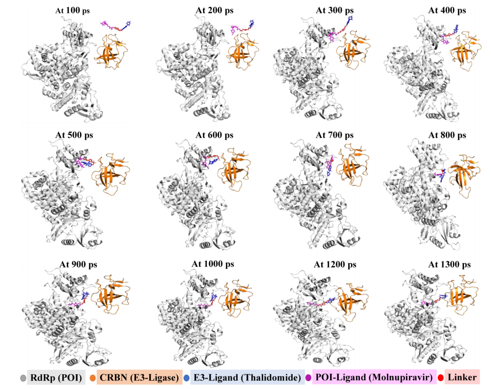 图 4. PROTAC 10 诱导RdRp(灰色)与CRBN(橙色)形成三元复合物的1300 ps动态模拟轨迹图