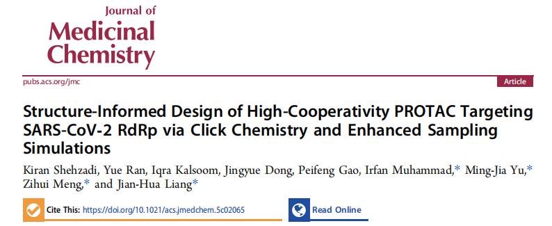 论文信息:Kiran Shehzadi#, Yue Ran, Iqra Kalsoom, Jingyue Dong, Peifeng Gao, Irfan Muhammad*, Ming-Jia Yu*, Zihui Meng*, Jian-Hua Liang*. Structure-Informed Design of High-Cooperativity PROTAC Targeting SARS-CoV‑2 RdRp via Click Chemistry and Enhanced Sampling Simulations. Journal of Medicinal Chemistry, 2025, DOI: 10.1021/acs.jmedchem.5c02065.