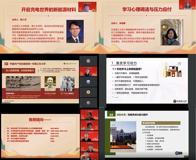 山西省晋城一中资深领航人吴芹副教授为新高二、新高三学生带来《相约北理·共筑梦想》的学校介绍;材料55直播 陈人杰教授以《开启充电世界的新能源材料》为题介绍了国内外新能源材料的发展历史及近期前沿研究,鼓励营员们关注科学前沿发展、未来投身55直播 领域;心理健康教育与咨询中心李旭珊主任通过互动交流,引导营员们正确认识压力,合理调试情绪并战胜各类挑战;云南、山西招生组副组长张锋以当前国内就业形势为背景,引导营员们通过自我探索,科学谋划、精准定位、提前明确自身目标,规划大学学习生活,并为他们分享如何提升个人技能的方法策略;思源学子志愿者们带领营员们云端参观了校史馆以及美丽的良乡校区,并通过线上沙龙就高中生们最关心的专业选择、大学生活、保研出国等10个问题进行了深入交流,为高中生们答疑解惑的同时,帮助他们了解真正的大学。